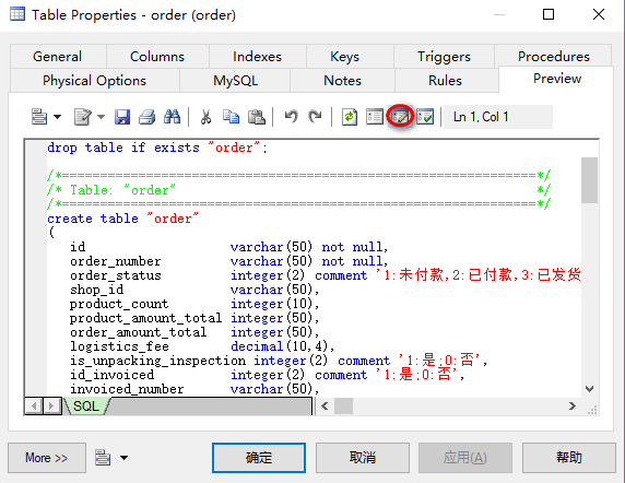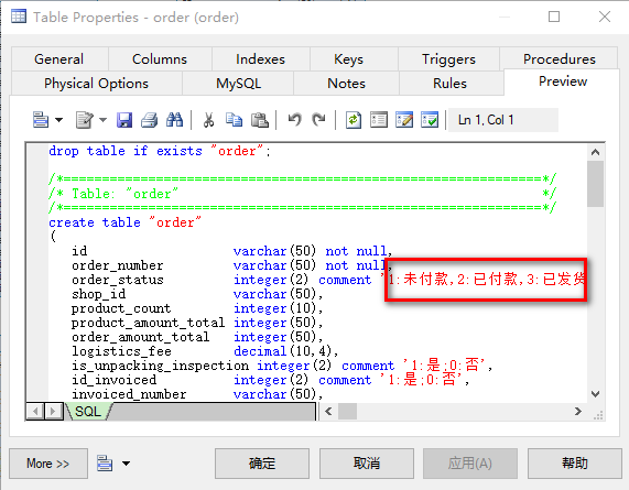 3.第三步,选择“Preview”tab,查看SQL预览,发现我们编辑的column已经有了注释信息,如下图所示: