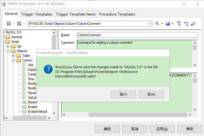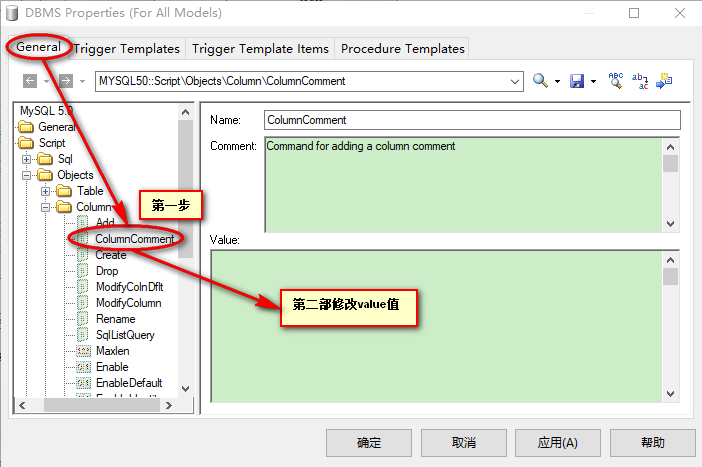 2.第一步,按“Script”»“Object”»“Column”»“ColumnComment”打开,然后将value中的信息改成“alter table [%QUALIFIER%]%TABLE% modify column %COLUMN% %DATATYPE% comment %.60qA:COMMENT%”,最后点击“确定”(注意:不包含双引号,否则导入mysql语法报错)如下图所示: