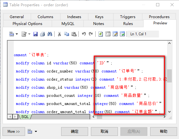 6.第六步,查看SQL预览,发现对所有的column添加了注释,如下图所示:
